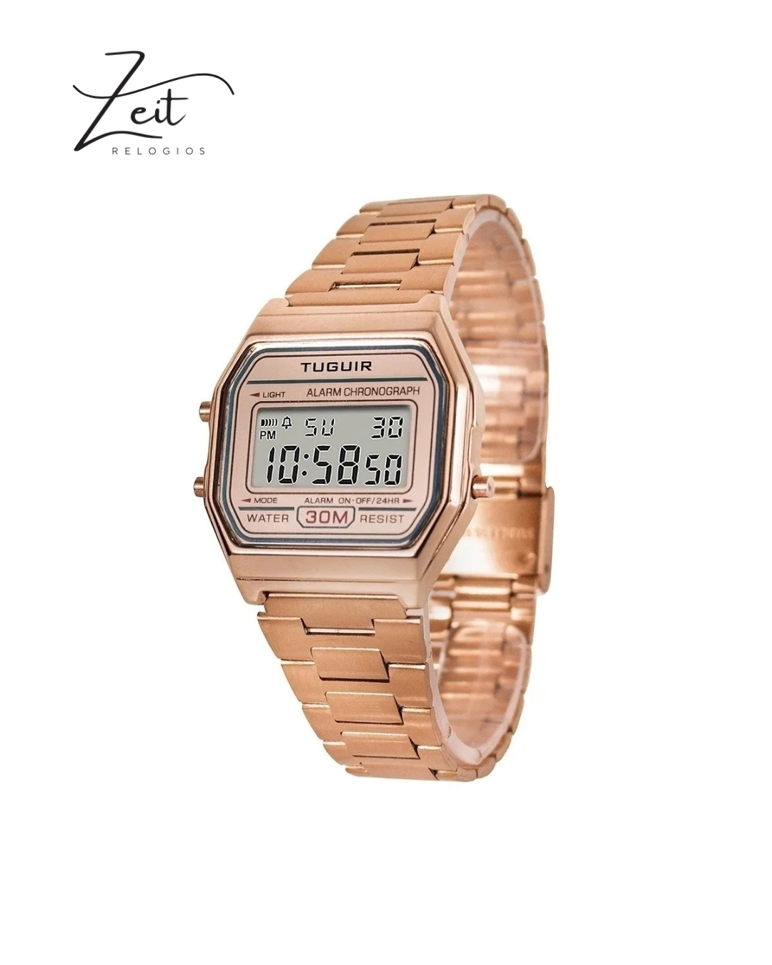 O Relógio Tuguir TG136 combina elegância e praticidade em um design moderno e sofisticado. Com acabamento rose e tela digital minimalista, é a escolha perfeita para quem busca estilo e funcionalidade no dia a dia.