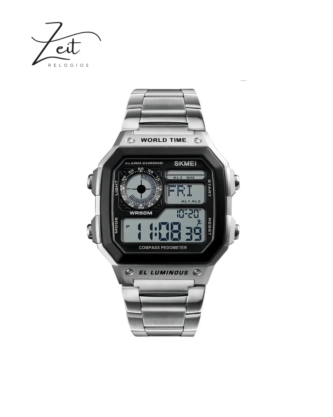 Este relógio analógico combina elegância, precisão e funcionalidades práticas em um único acessório. Com caixa de 4,3 cm em aço inoxidável prateado e pulseira de inox, ele oferece durabilidade, estilo e conforto para o uso diário.