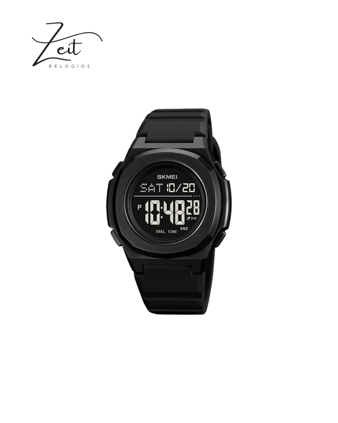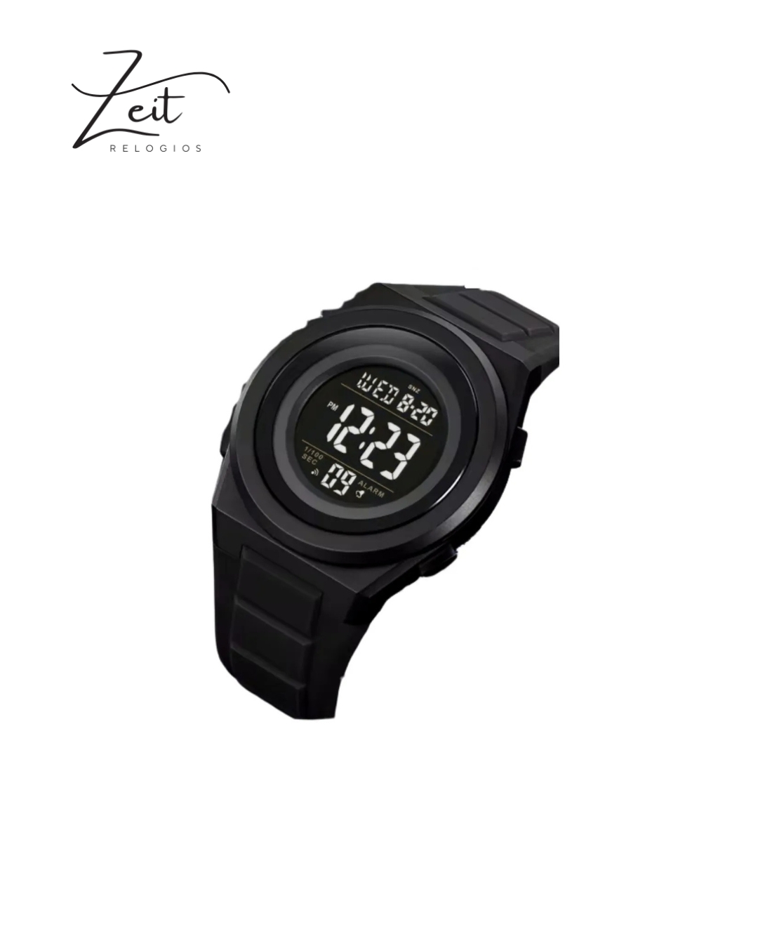 Com caixa redonda de 45 mm em plástico resistente e pulseira em borracha confortável, o modelo foi projetado para oferecer durabilidade sem perder o conforto no pulso. Seu visor digital completo apresenta dois horários, cronômetro, alarme, calendário e contador regressivo — perfeito para rotina, treinos e uso diário.