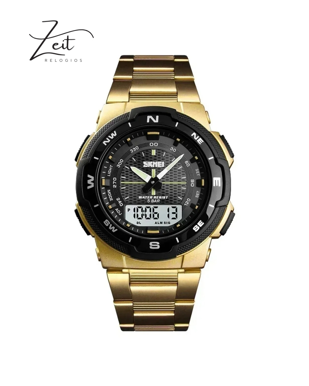 Este relógio oferece funções analógicas e digitais, incluindo cronômetro, alarme, calendário e ponteiros fluorescentes para melhor visualização no escuro.