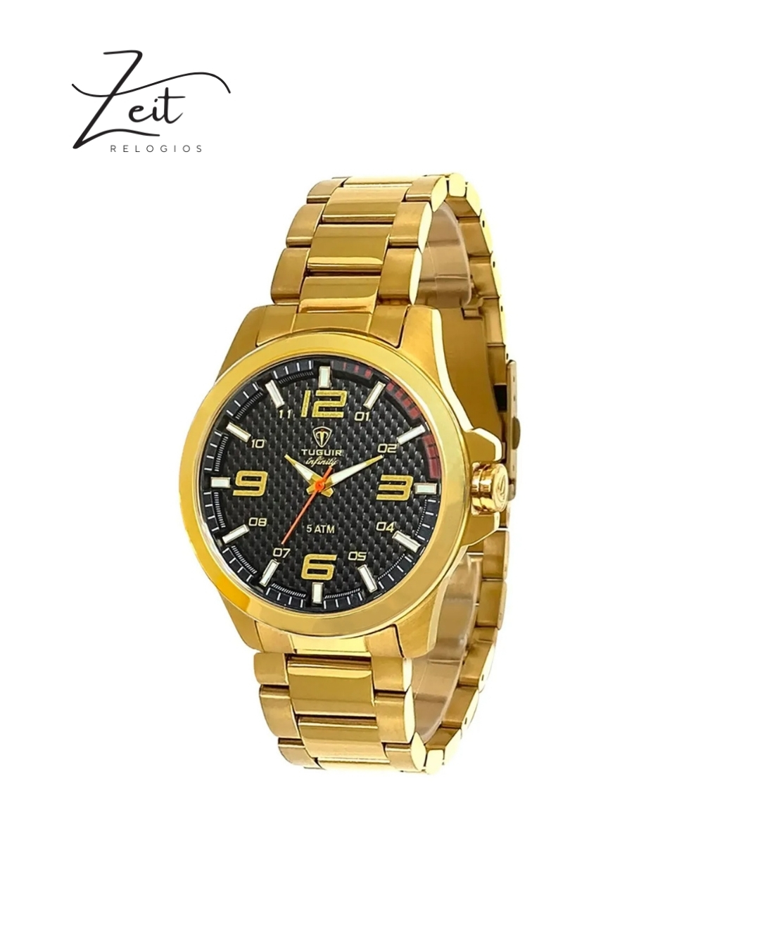 A pulseira em aço dourado com fecho dobrável com botão alia conforto e segurança, destacando-se pela resistência e acabamento sofisticado.