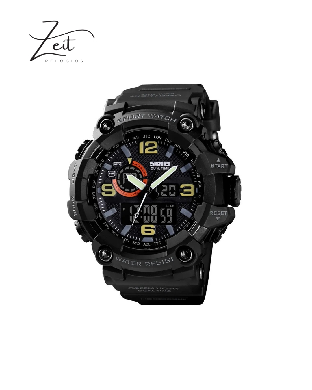 Possui funções essenciais como cronômetro, alarme e calendário, além de ponteiros fluorescentes e luz verde, garantindo fácil visualização tanto de dia quanto à noite. A construção resistente permite uso no dia a dia com conforto e durabilidade.